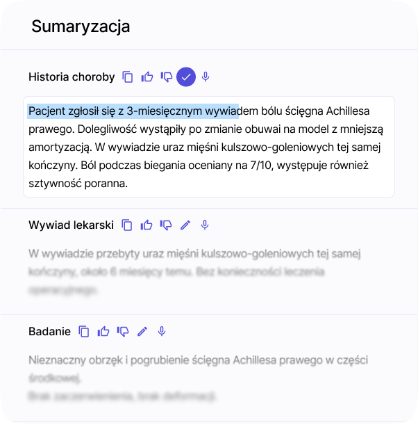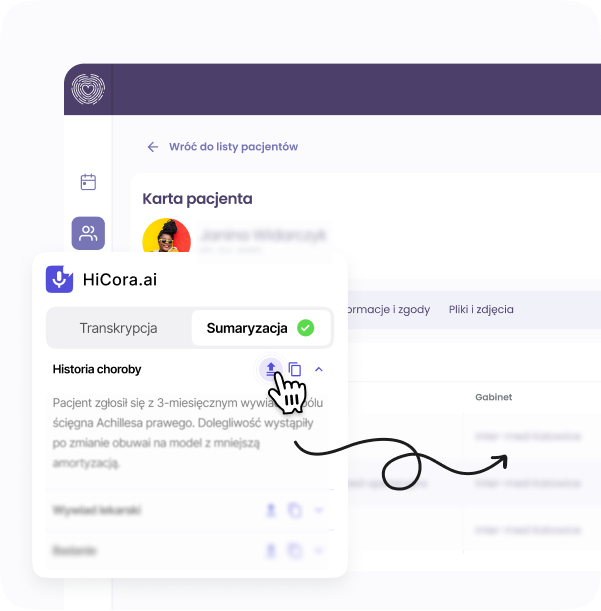 Sztuczna inteligencja precyzyjnie zapisuje przebieg wizyty, tworząc sumaryzację gotową do wklejenia do Twojego systemu dokumentacji